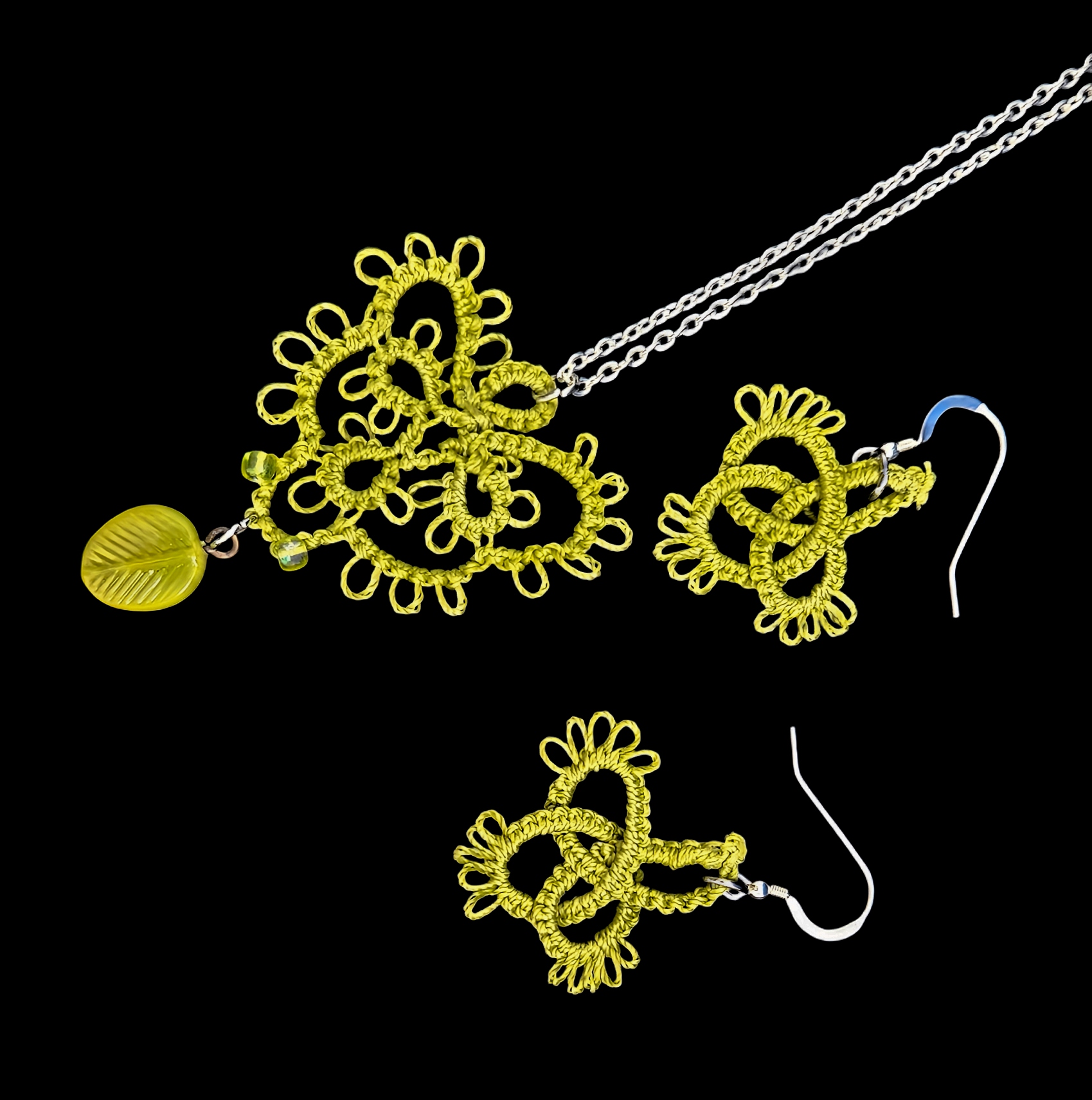 Necklace is 2” x 2”, Earrings – 1 ½” x 1 ½” – Celtic hand tatted necklace and earrings. Please specify in MESSAGES colors desired. If no colors are specified, items will be made as shown